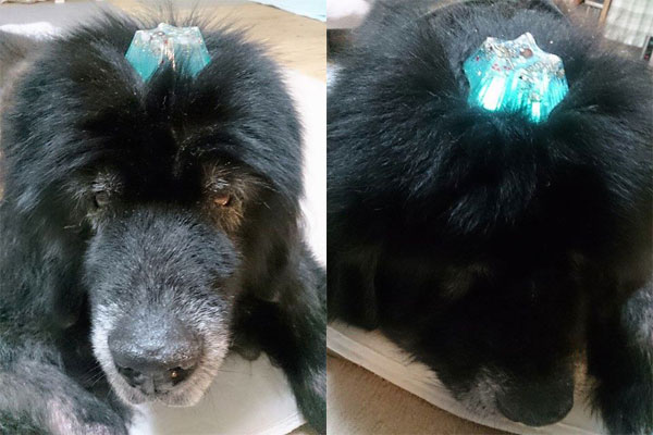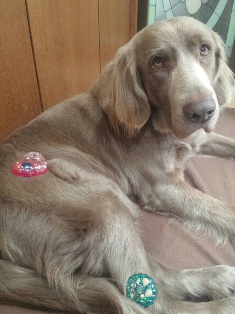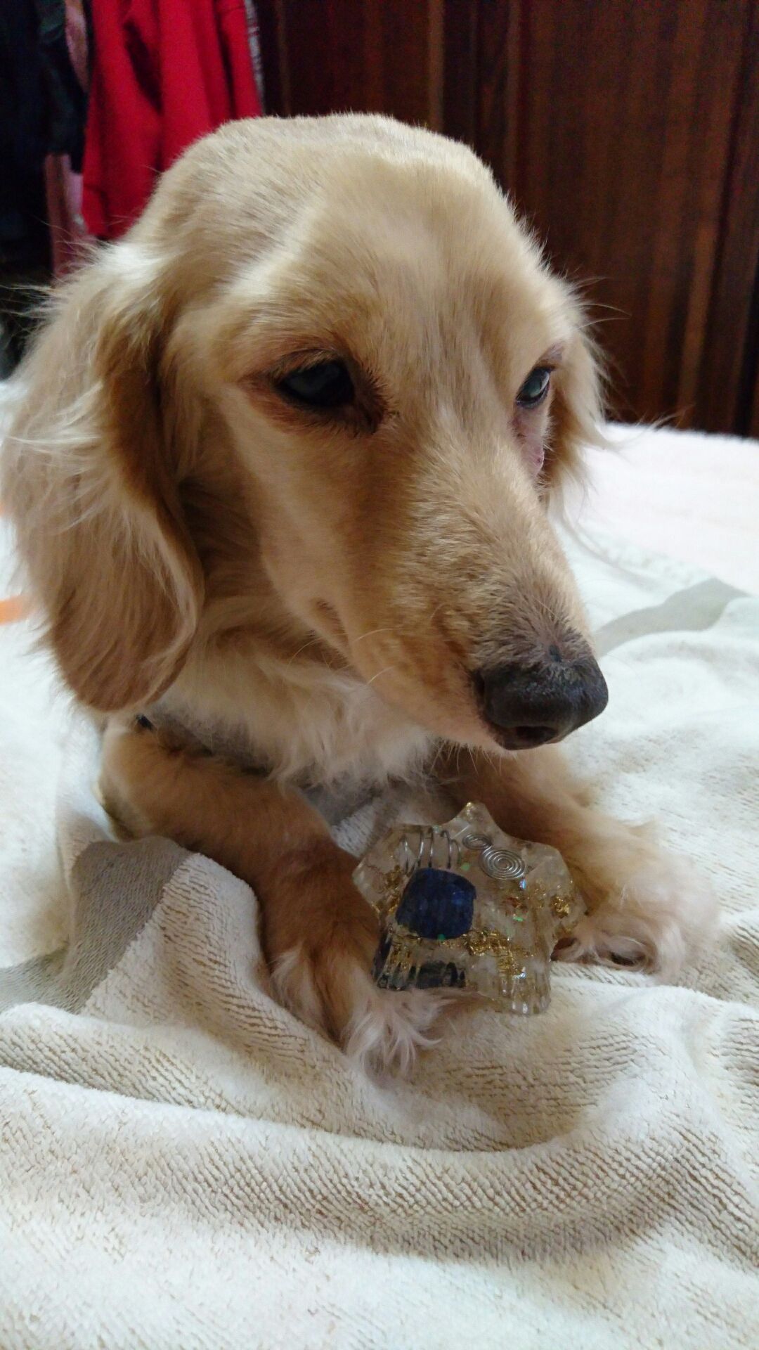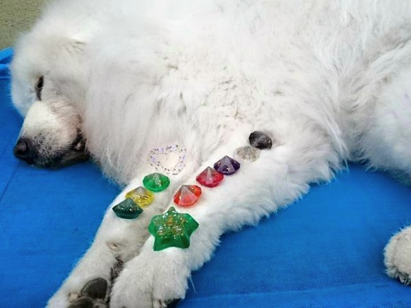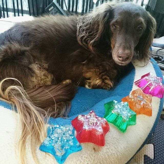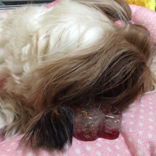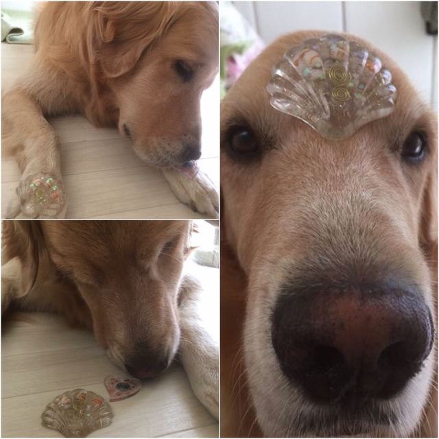 愛犬がオルゴナイトを載せたら、穏やか表情をしたので、
